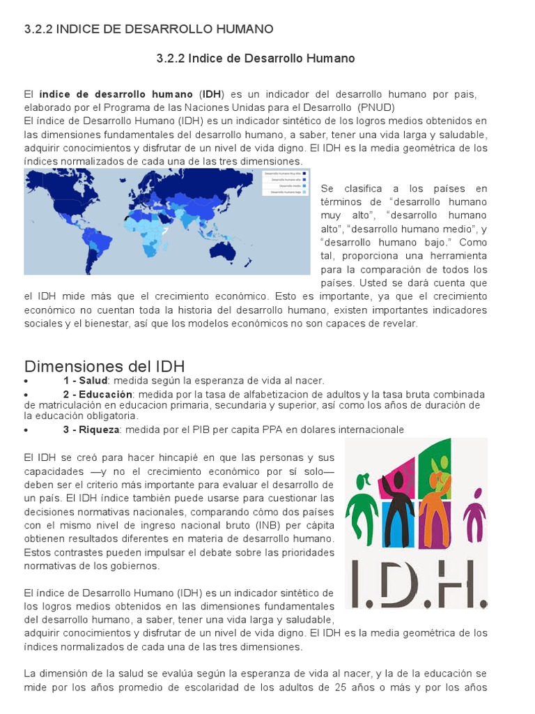 El IDH mide el progreso conseguido por un país en tres dimensiones básicas del desarrollo humano disfrutar de una vida larga y saludable, acceso a educación y nivel de vida digno Parámetros del índice de desarrollo humano El IDH se calcula, en la medida de lo posible, sobre la base de datos de las principales entidades nacionales y